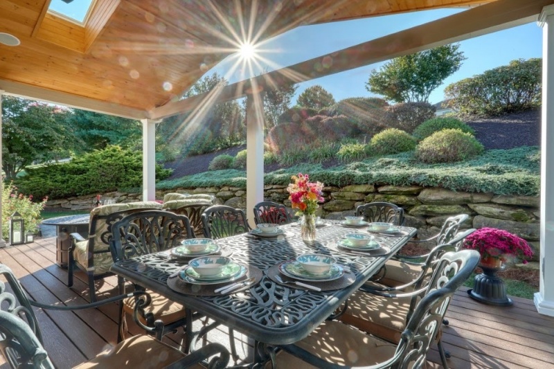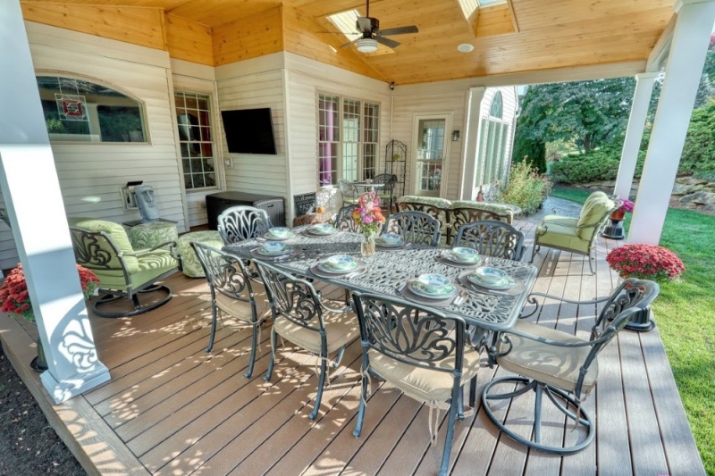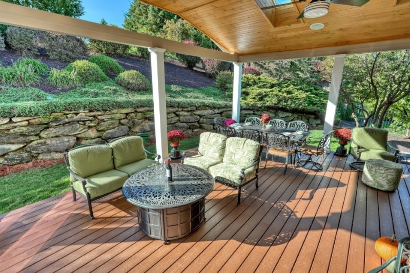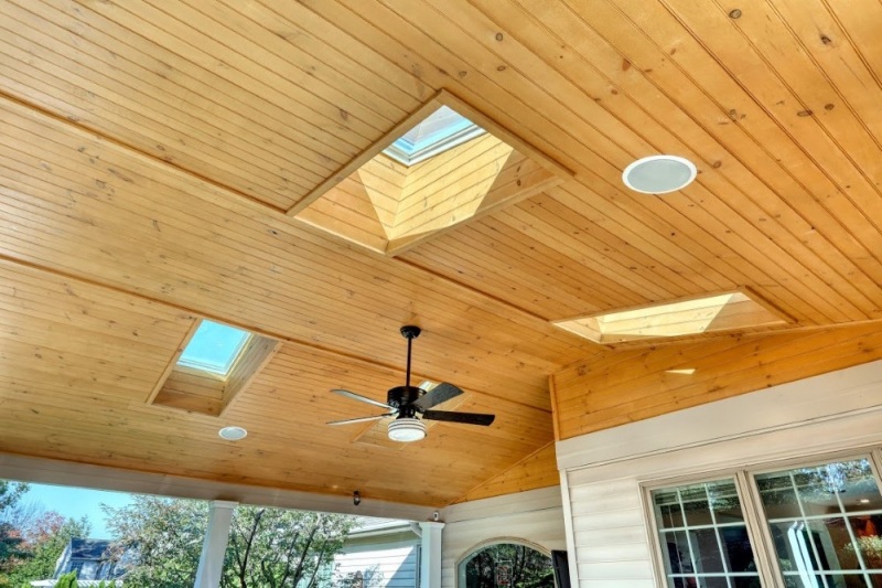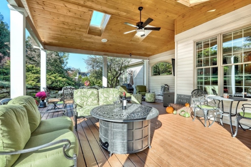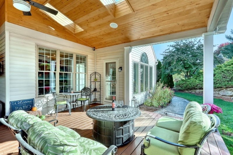These clients already had an existing slate patio but lacked an overhead roof covering, the hot sun was a deterrent to enjoying the outdoors in the summer months. After discussion about the design it was decided that we build over the existing stamped concrete patio using the Trex, Enhance® composite decking in the Saddle color. A peaked roof was designed incorporating (4) Velux® non-operable skylights to allow sufficient light into the interior kitchen area. The cathedral ceiling was finished off using 8-inch wide tongue and groove pine and stained with a cedar stain by Sherwin-Williams. Pre-cast columns were installed to provide structure support and are also aesthetically please to the eye.