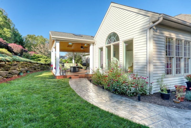 The existing stamped walkway was refinished that leads from the driveway to the back of the outdoor living space.